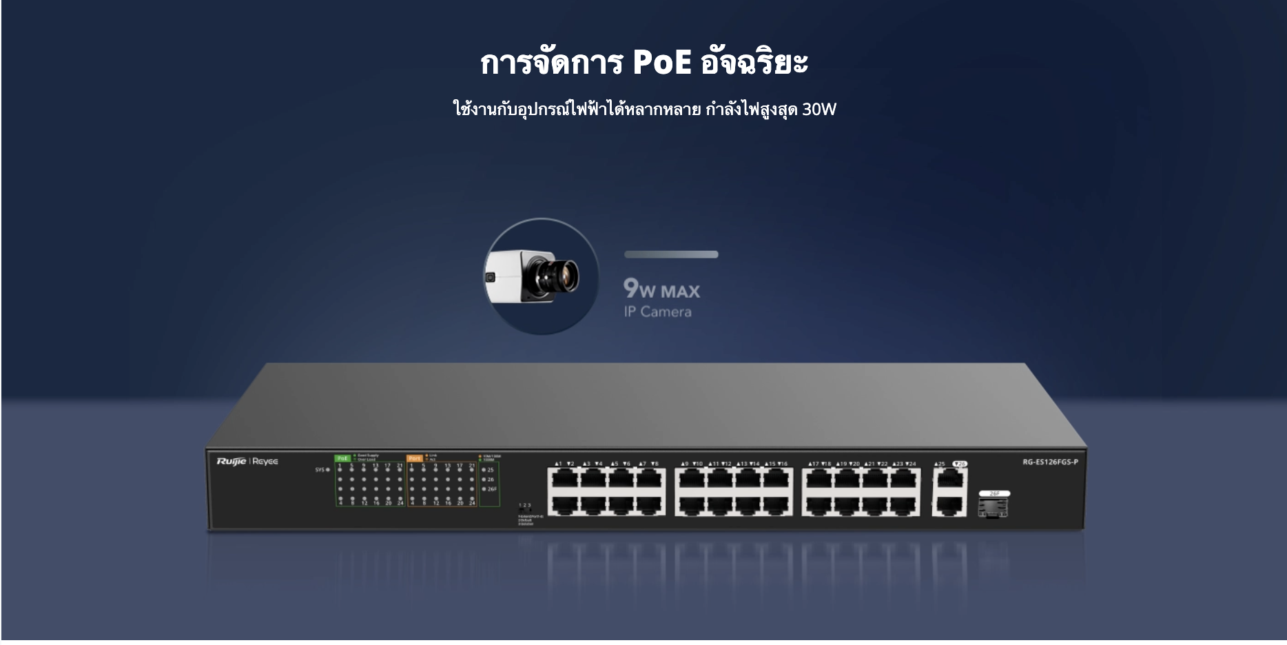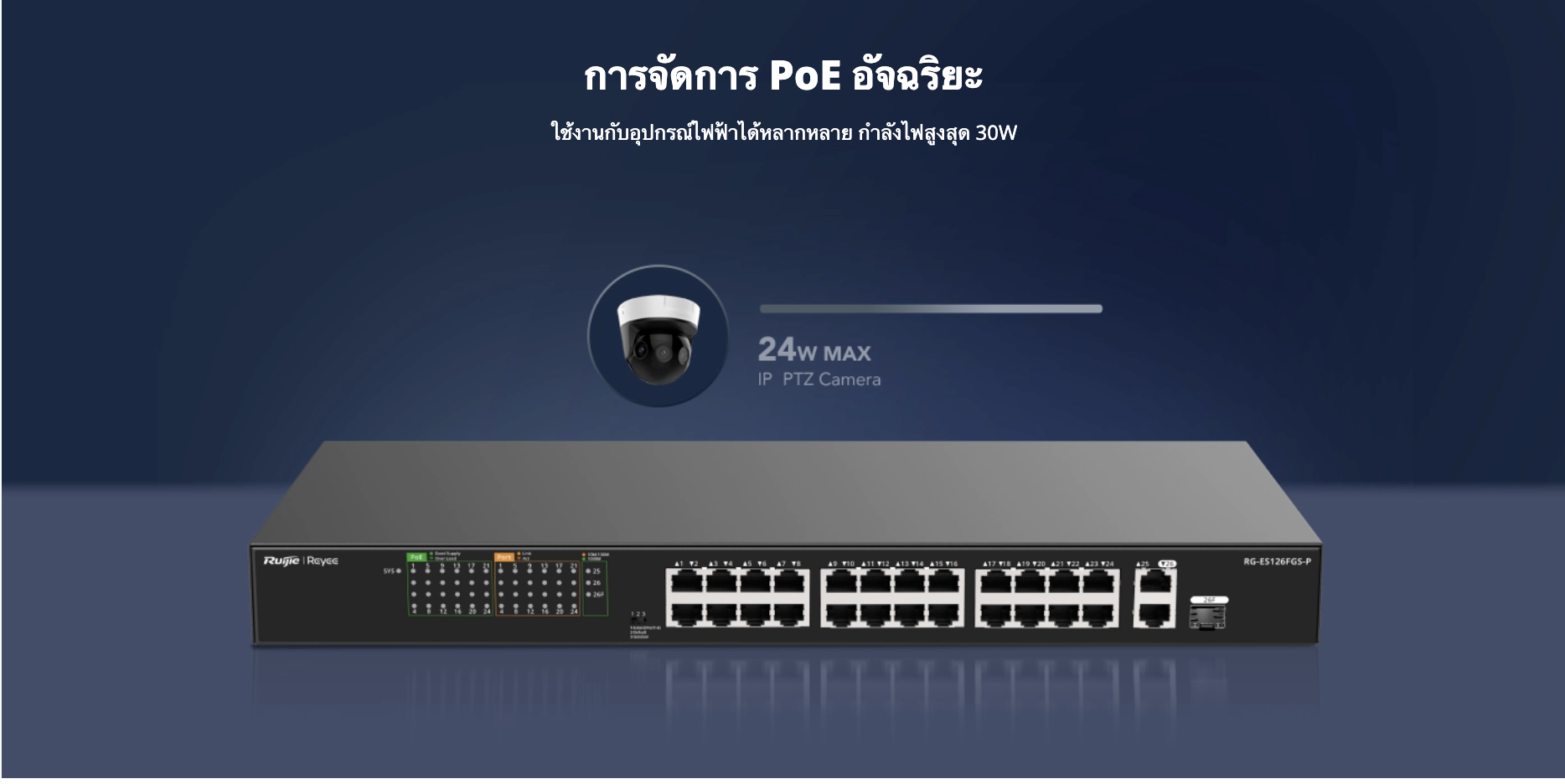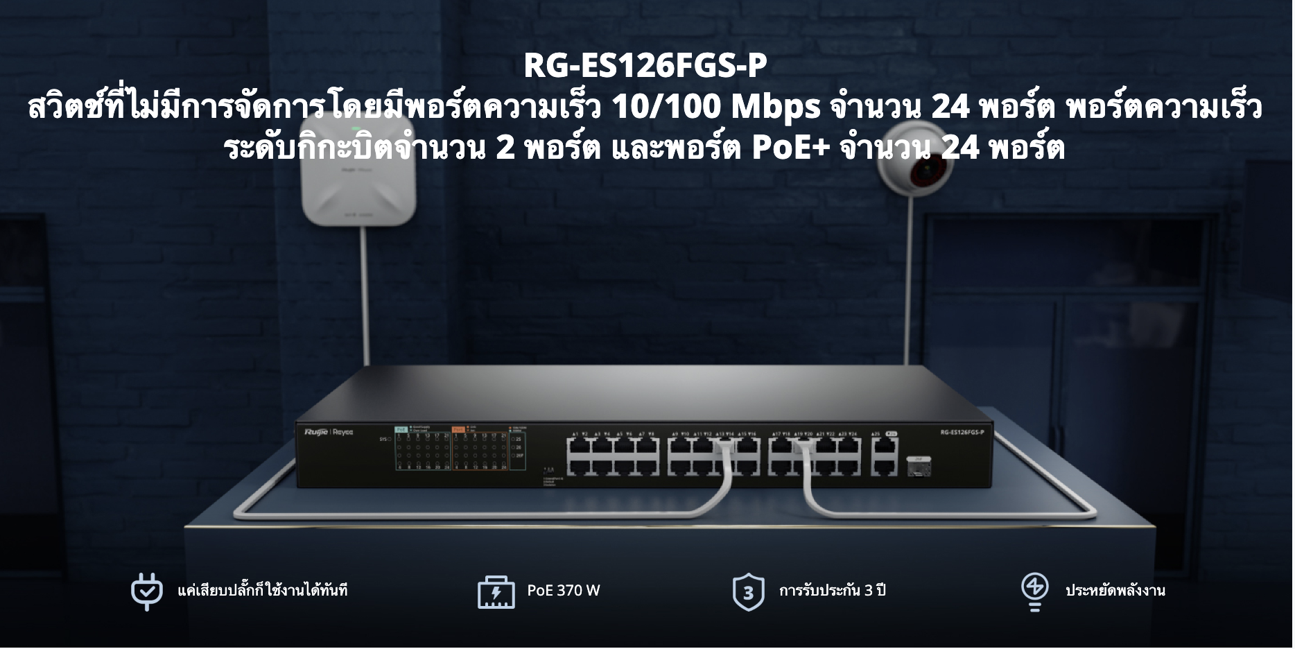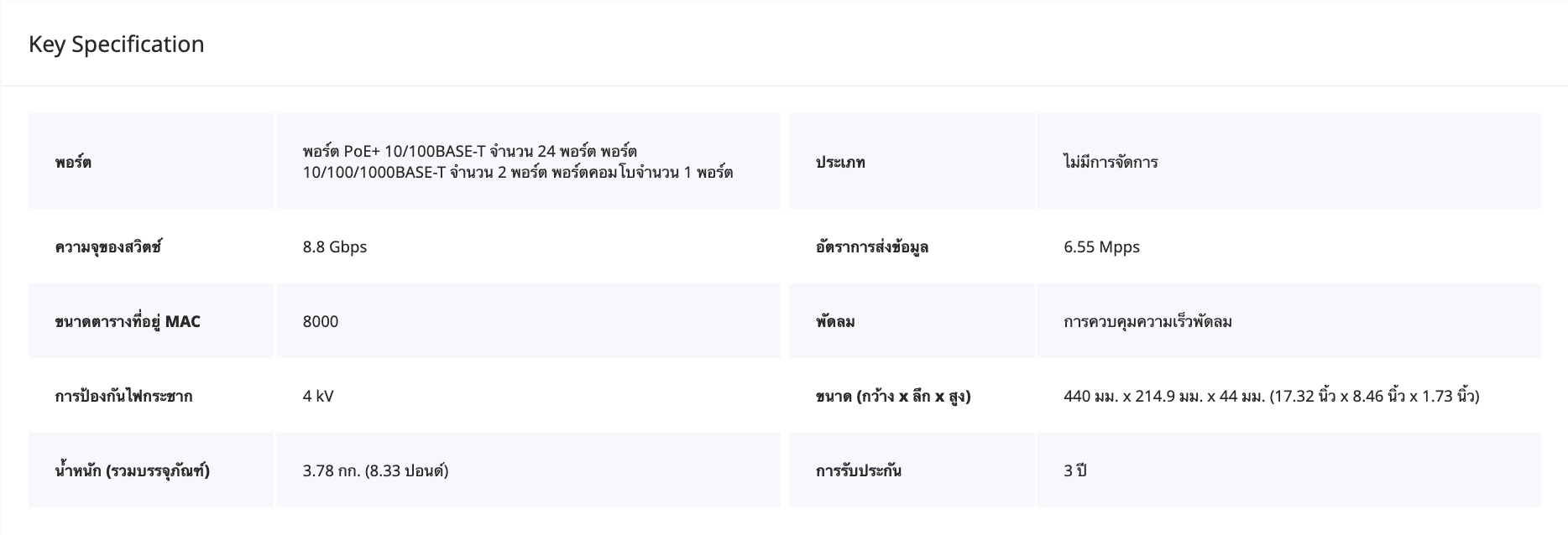 • สวิตช์ที่ใช้ PoE ที่ไม่มีการจัดการโดยมีพอร์ตความเร็ว 10/100Mbps จำนวน 24 พอร์ตและพอร์ตความเร็วระดับกิกะบิตจำนวน 2 พอร์ต