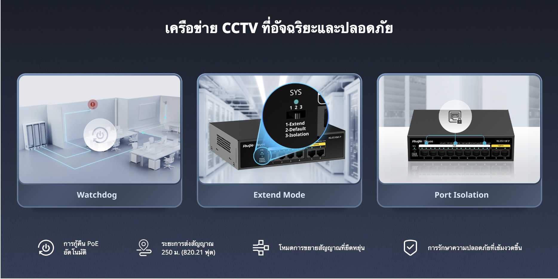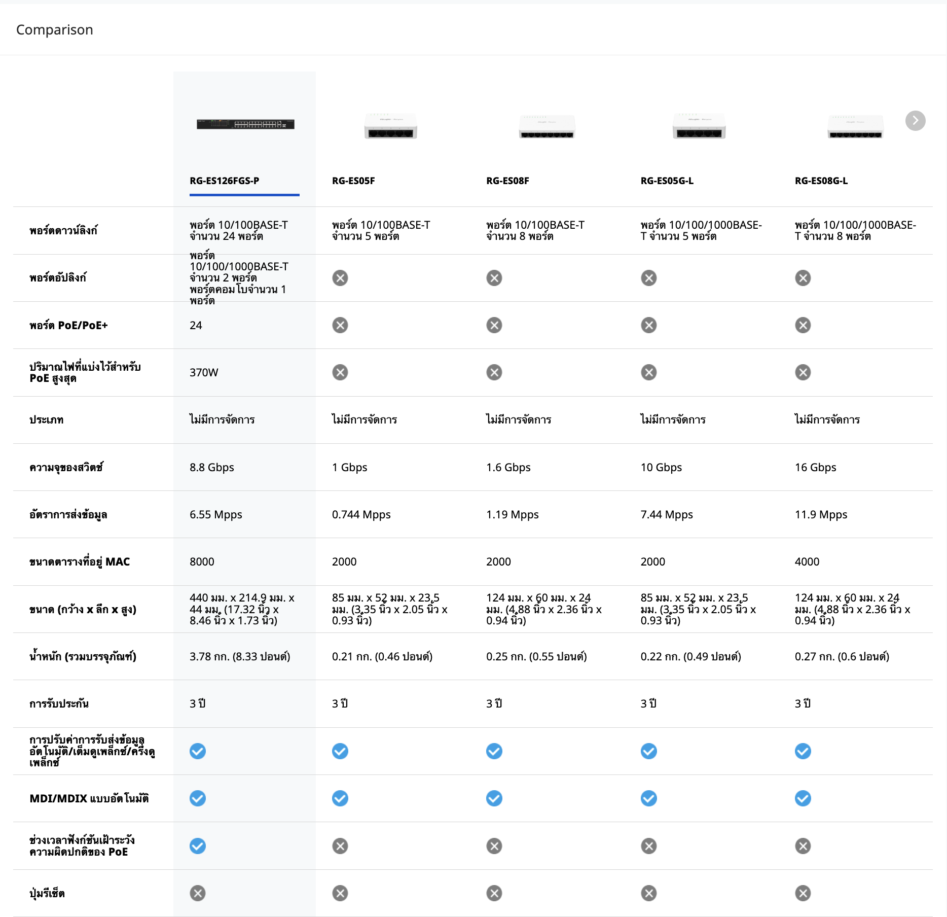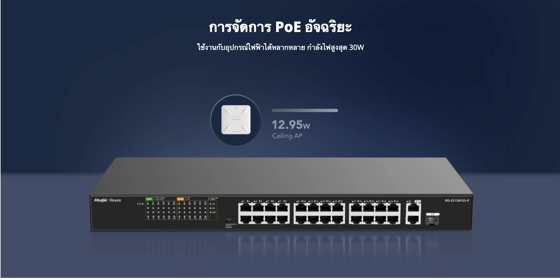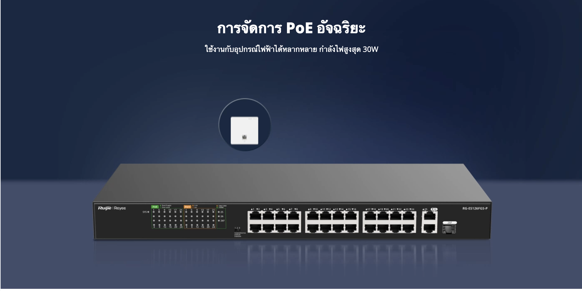 • สวิตช์ที่ใช้ PoE ที่ไม่มีการจัดการโดยมีพอร์ตความเร็ว 10/100Mbps จำนวน 24 พอร์ตและพอร์ตความเร็วระดับกิกะบิตจำนวน 2 พอร์ต