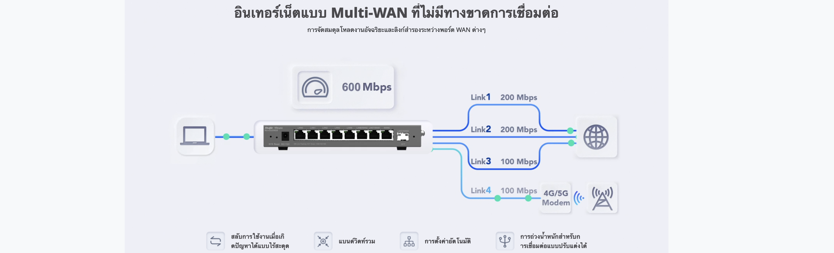 • การจัดสมดุลโหลดงานอัจฉริยะและลิงก์สำรองระหว่างพอร์ต WAN ต่างๆ