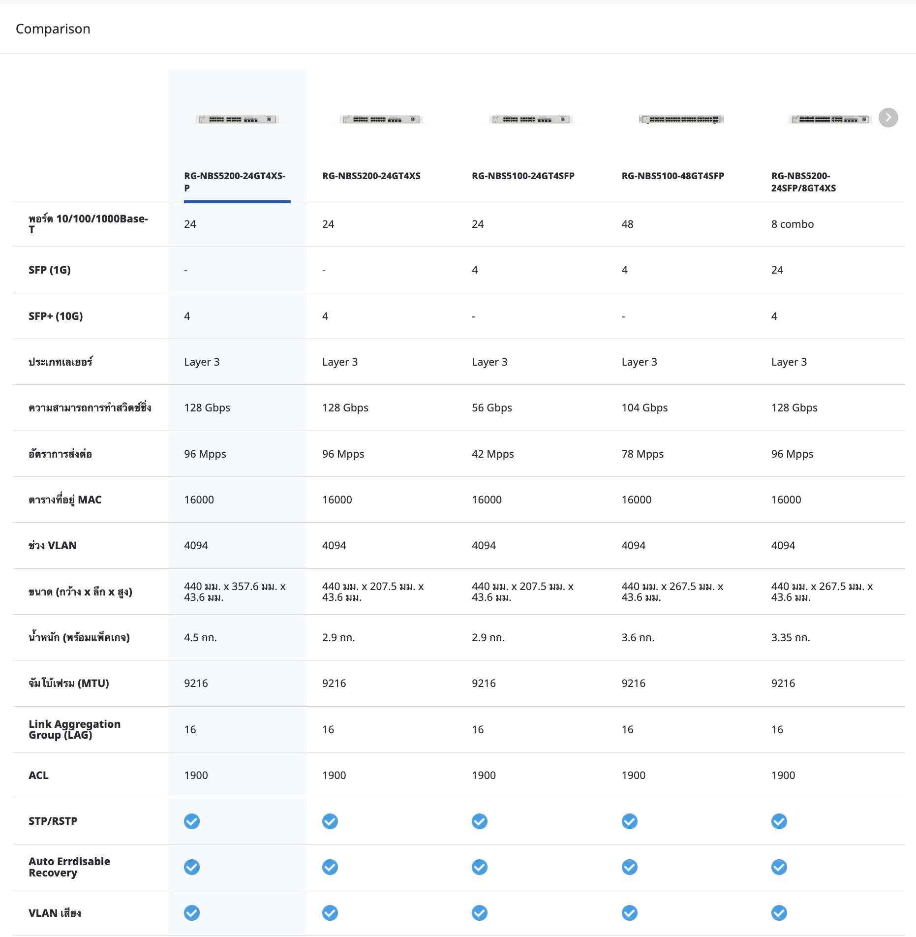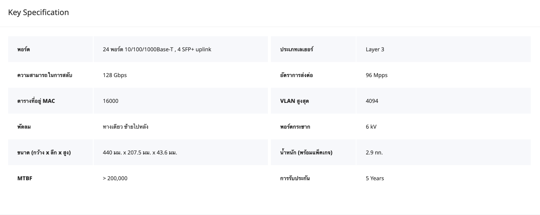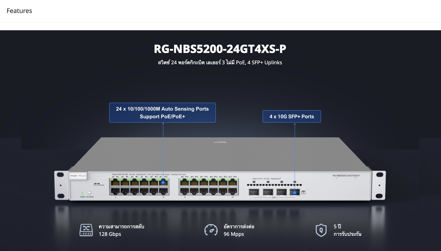 • สวิตช์ 24 พอร์ตกิกะบิต เลเยอร์ 3 ไม่มี PoE, 4 SFP+ uplink