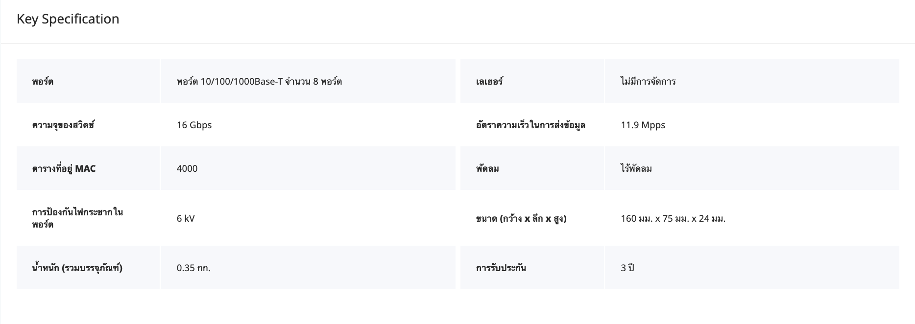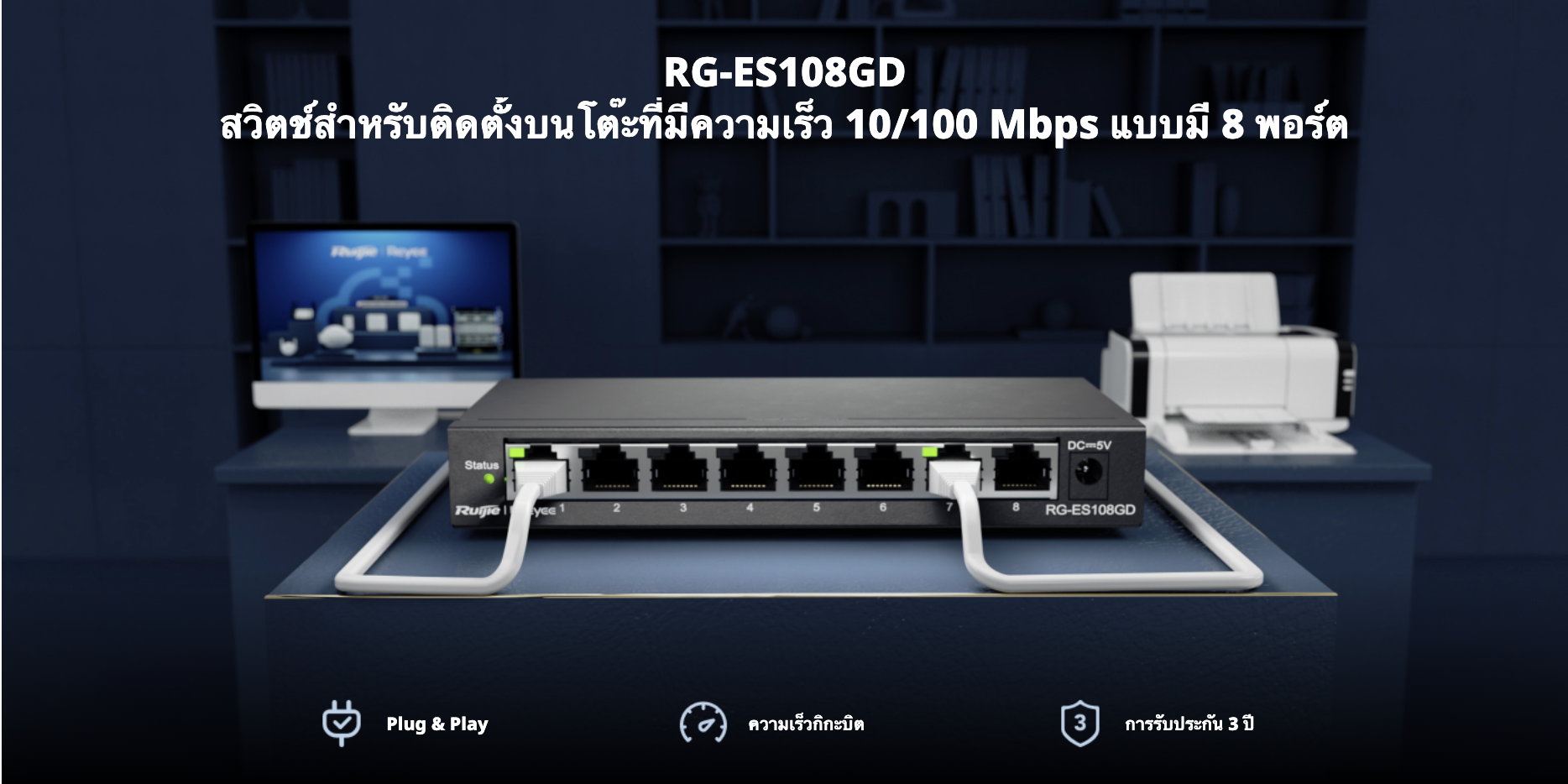 • สวิตช์ที่ไม่ใช้ PoE ที่ไม่มีการจัดการสำหรับติดตั้งบนโต๊ะ โดยมีพอร์ตความเร็ว 10/100/1000Mbps จำนวน 8 พอร์ต