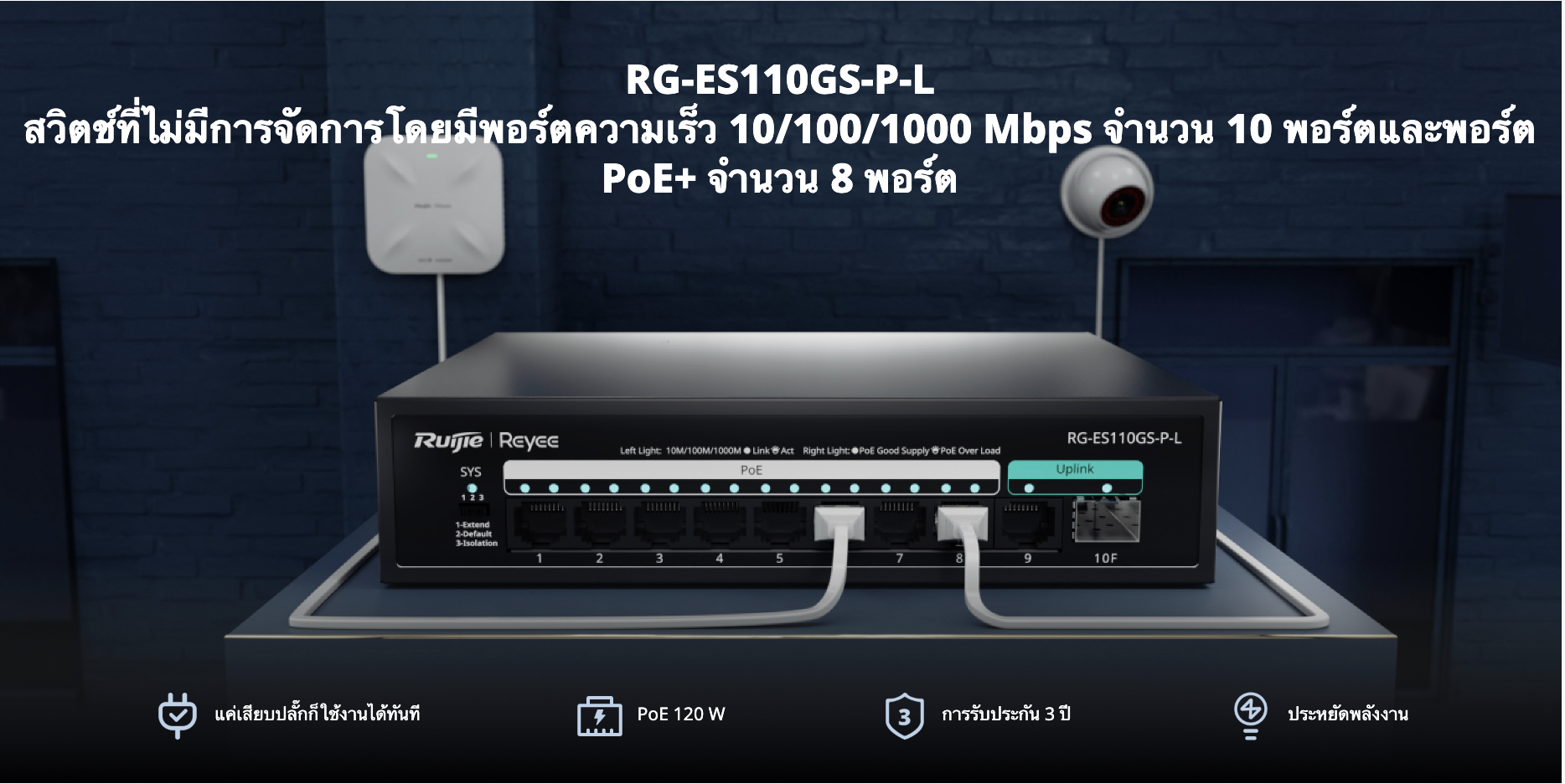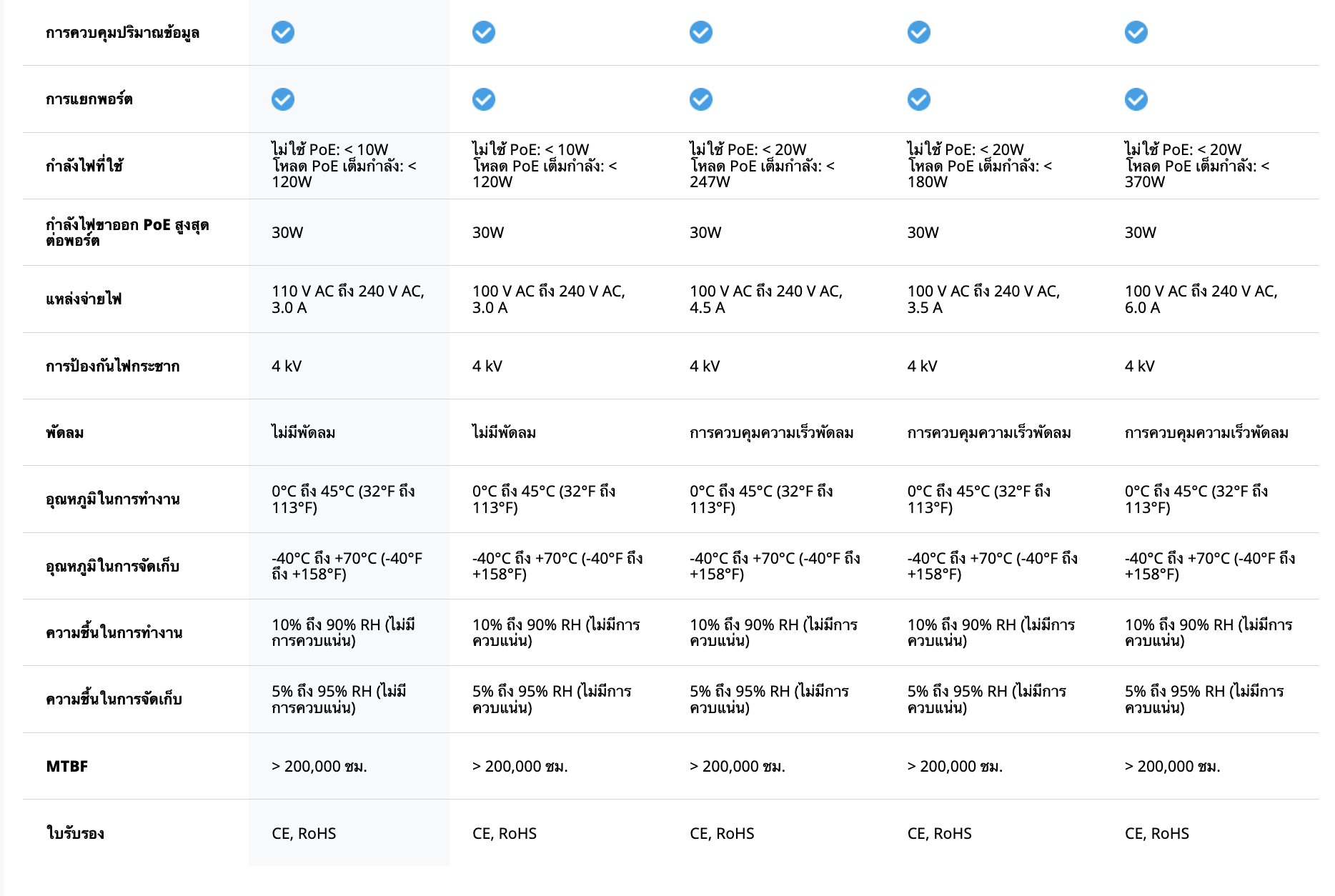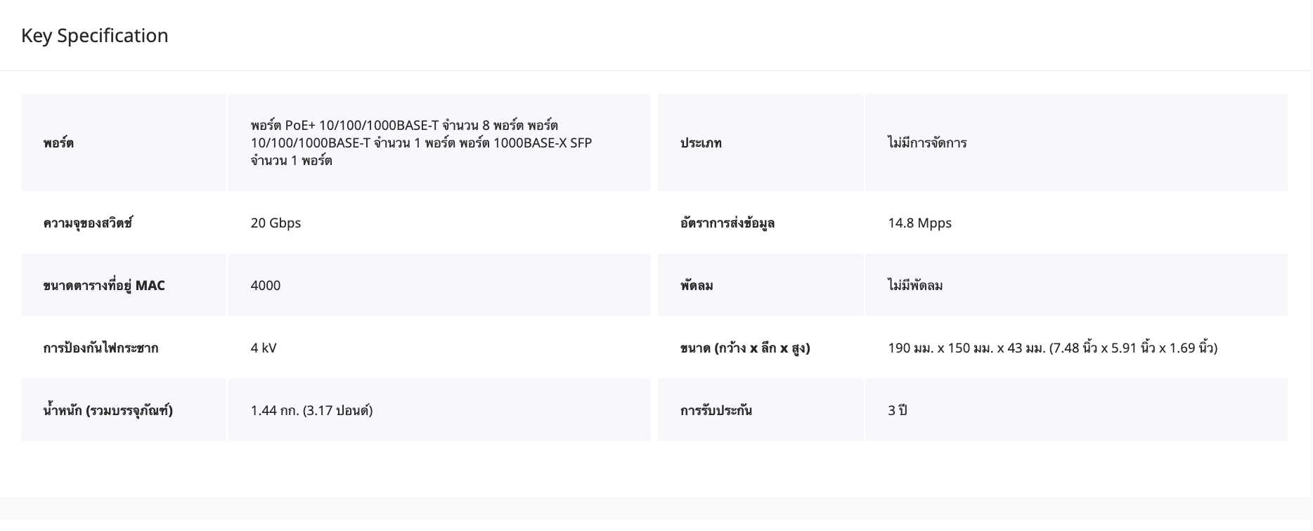 • สวิตช์ที่ใช้ PoE ที่ไม่มีการจัดการโดยมีพอร์ตความเร็ว 10/100/1000 Mbps จำนวน 10 พอร์ต