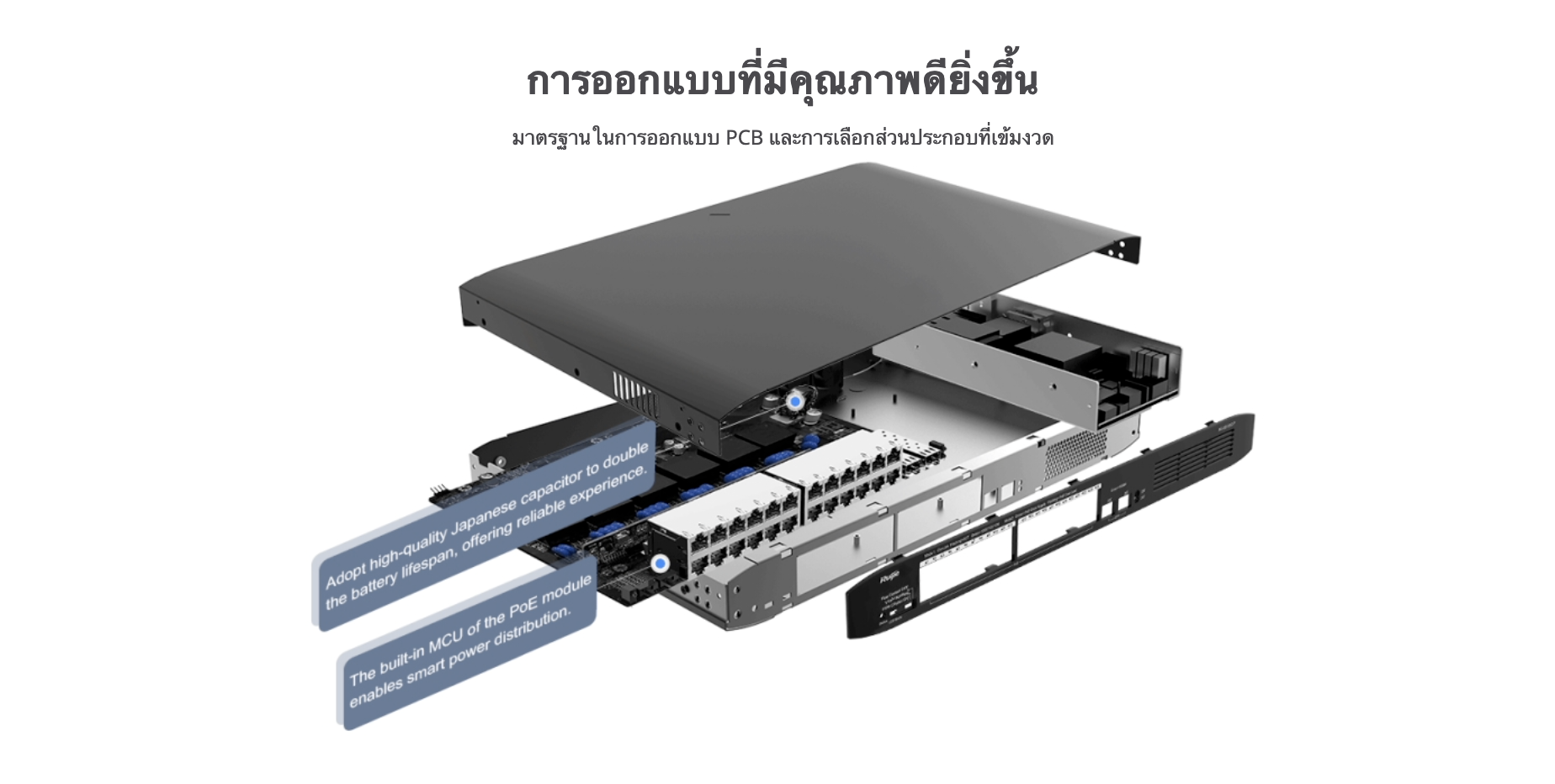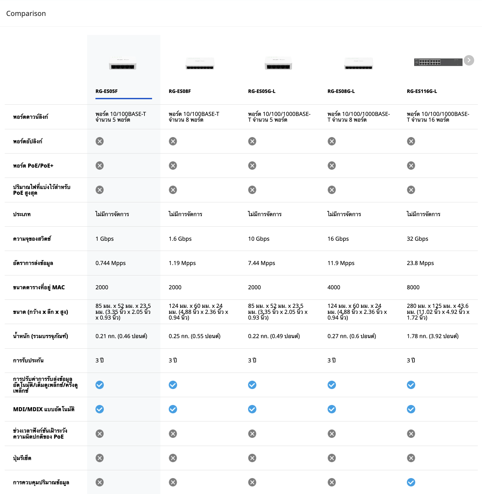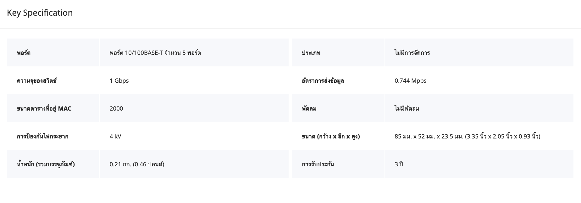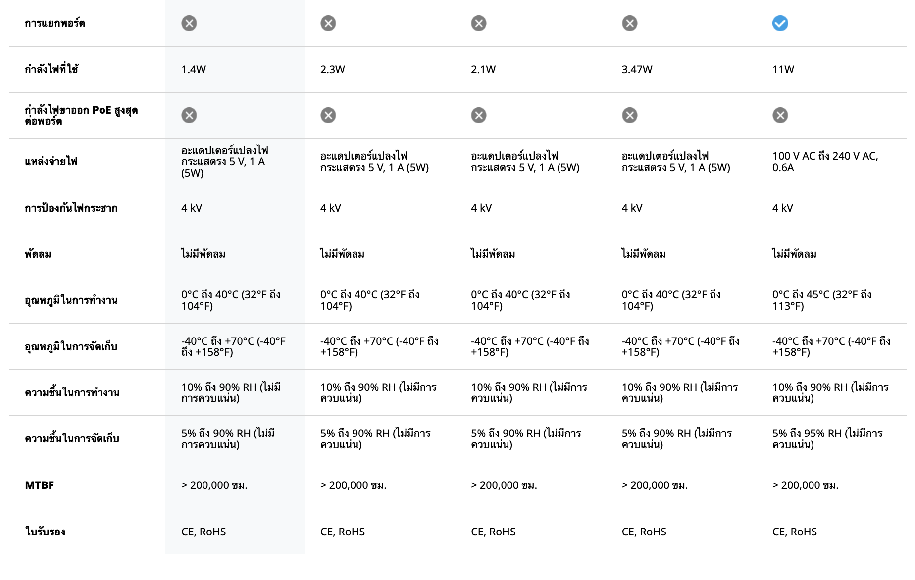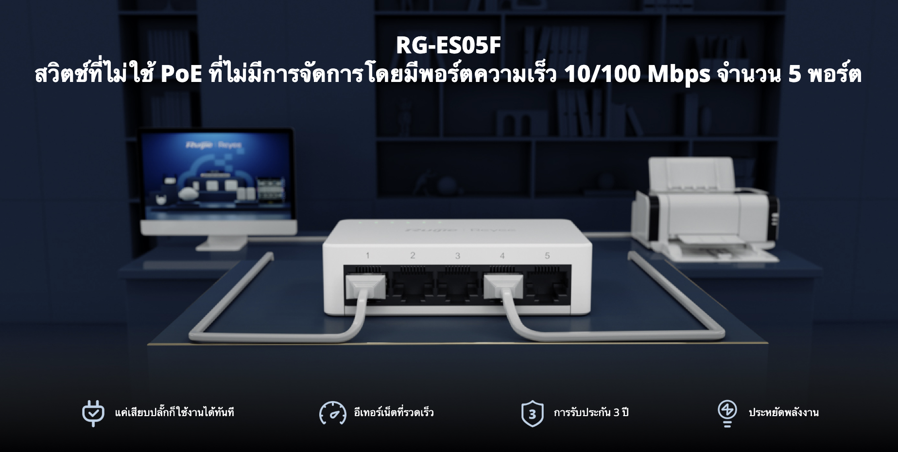 • สวิตช์ที่ไม่ใช้ PoE ที่ไม่มีการจัดการโดยมีพอร์ตความเร็ว 10/100 Mbps จำนวน 5 พอร์ต